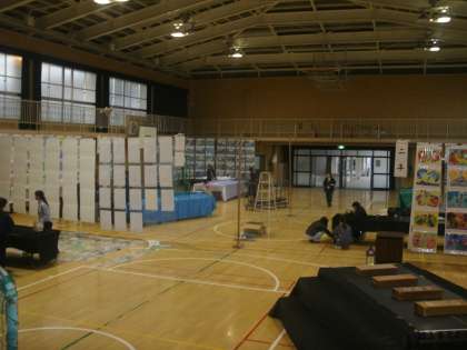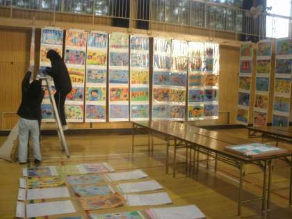 放課後、作品展の準備を始めました。管理作業員さんがワイヤーを張り、そのワイヤーに先生たちが子どもたちの図画作品をつるしていきました。フロアーには机や卓球台を展示台にするために並べました。