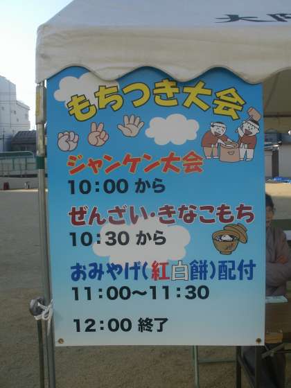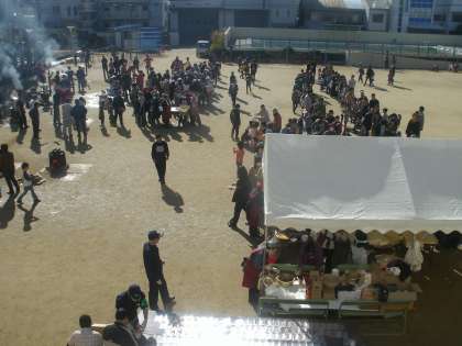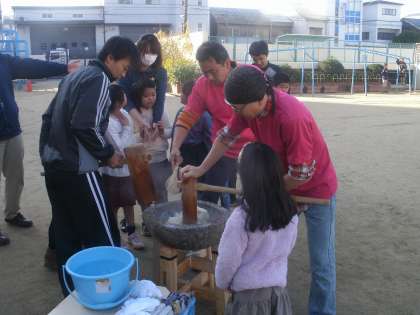 前日の雨もあがり、青空の広がる中、今年度の東中浜もちつき大会が開催されました。毎年、1000人を超える人が集まります。朝早くからもち米を蒸すかまどの煙が立ち、お米の良いにおいが運動場に広がりました。たくさんの地域、PTAの人たちがいそがしげに、ある人は日の番で真っ赤になっていっしょうけんめい立ち働いてくださっていました。