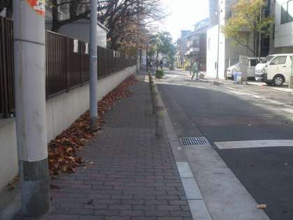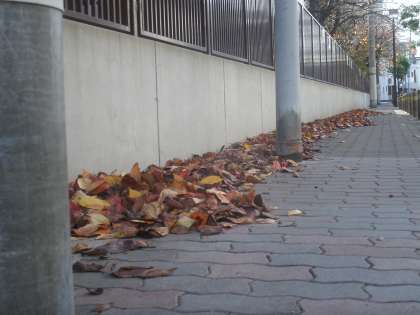 学校の西側の塀沿いです。桜の葉が昨日来の強い風で大量に散りました。毎日落ち葉の清掃は大変なのですが、今日は最大の量でした。