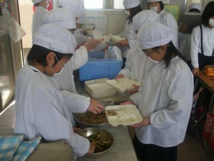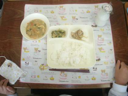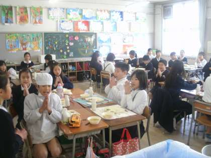 4年生をたずねました。こんだては、「豚肉のしょうが焼き」「さつまいものみそ汁」「きくなとはくさいのごまあえ」。外国語講師のミチ・タカダ先生も「とてもおいしかった」とおっしゃっていました。