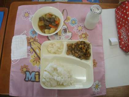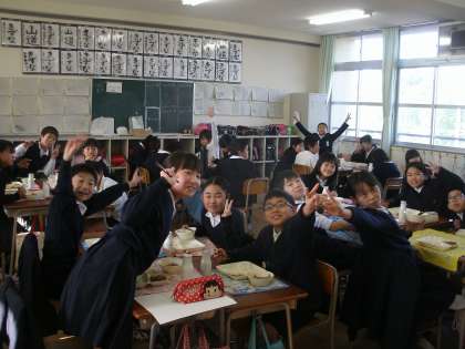 5年3組をたずねました。こんだては、「鶏肉と野菜の煮もの」「じゃこ豆」「かぶのゆず風味」。おいしい給食にいい表情の5年生です。