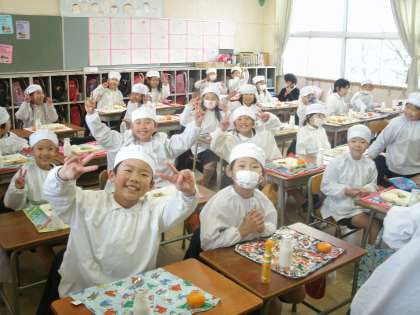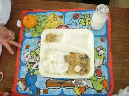 2年3組をたずねました。今日のこんだては、「中華丼」「もやしの中華あえ」「みかん」。具の炒め具合に調理員さんの愛情がこもっています。