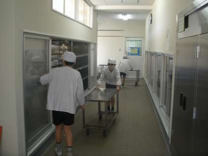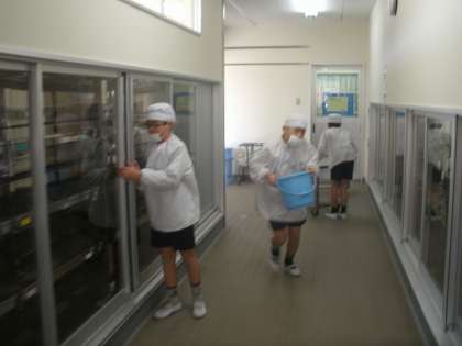 児童会給食委員会の人たちが毎日準備と片付けの手伝いをします。手際よく、元気に活動する子どもたちです。