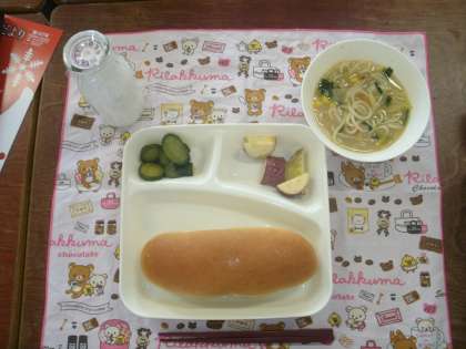 4年2組をたずねました。今日のこんだては「みそラーメン」「焼きさつまいもの甘みつかけ」「きゅうりの辛みづけ」。にぎやかで楽しい食事の始まりです。「今日の給食」シリーズはこれで全学級をたずねました。どの学級も楽しい雰囲気でした。