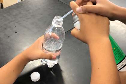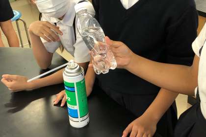 水に二酸化炭素を混ぜたペットボトルを振る実験をしました。