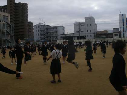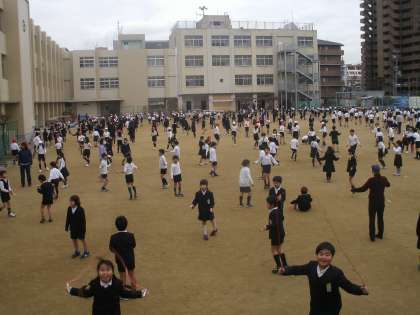 なわとび週間が今日から始まりました。2時間目と3時間目の休み時間に全校児童が運動場にとびなわを持って集まります。