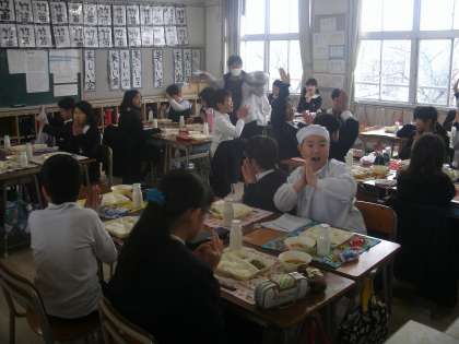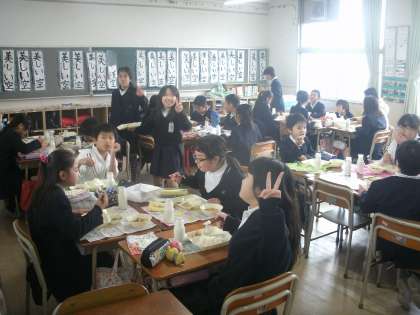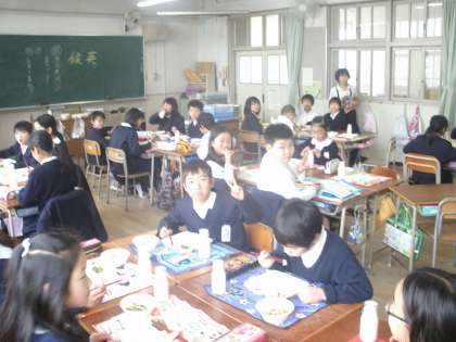 4年生をたずねました。なかよくにぎやかな給食風景です。