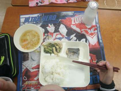 5年生をたずねました。こんだては「さごしのしょうゆだれかけ」「すまし汁」「みずなの煮びたし」。さごしは、やわらかくてうすあじなのがおいしくて、子どもたちに人気でした。
