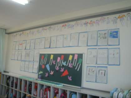 教室の後ろの掲示板には、子どもの3学期の目標を書いた小さな凧と冬休みの絵日記がはってありました。