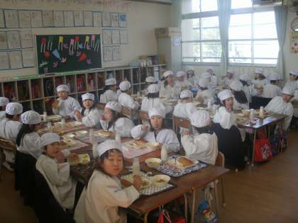 1年1組をたずねました。こんだては「ミートボールと野菜のケチャップ煮」「ツナとキャベツのソテー」「りんごのクラフティ」。