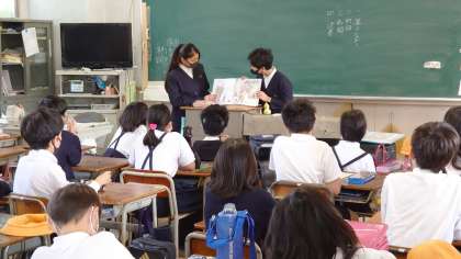 読書週間に合わせて、図書委員会の児童が低学年の教室に読み聞かせに行きました。とても上手に読み、低学年の子どもたちは集中して聞いていました。
