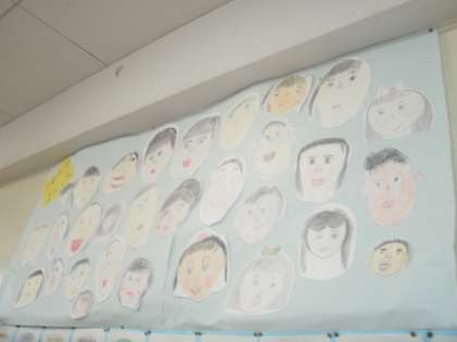 2年3組をたずねました。教室の後ろの掲示板に子どもの自画像がはってあって、にっこりと教室のみんなを見下ろしています。今日のこんだては「筑前煮」「ひじき豆」「だいこんのゆず風味」でした。