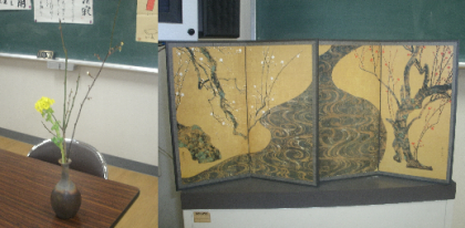 お茶の先生方が、梅の花と尾形光琳の絵の屏風を持ってきてくださいました。