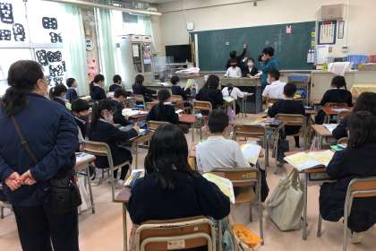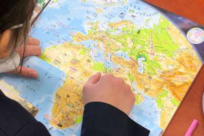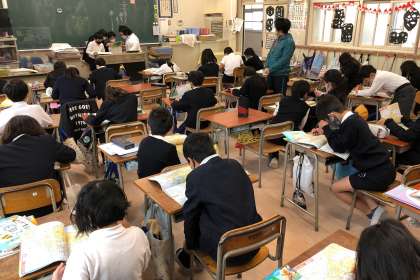 出題者が、地図帳のページを指定して、そこにある地名等を探す学習をしました。