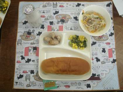 6年1組をたずねました。教室の掲示板に国語の学習でひとりひとりの調べた「名言集」がはってあります。クラーク博士やサッカーのペレ選手のことばなどが並んでいます。この日のこんだては「鶏肉のオイスターソース焼き」「ラーメン」「チンゲンサイとコーンの中華あえ」でした。