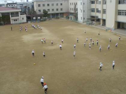 1年生が体育の学習でボールけりをしていました。笑顔と楽しげな声がいっぱいでした。