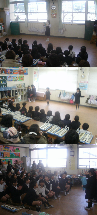 中:2年生は1・2くみは音楽の学習、3組は1年間の思い出を発表しました。