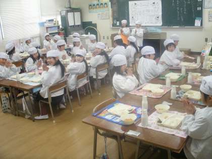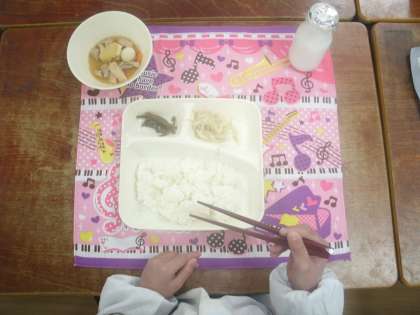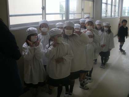 今日は1年2組です。給食当番の子どもたちが、先生の後にならんで、給食室にごはんや牛乳、おかずを取りに行きます。今日のこんだては「関東煮」「もやしのゆず風味」「茎わかめのつくだ煮」です。手を合わせて「いただきます!」