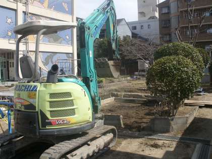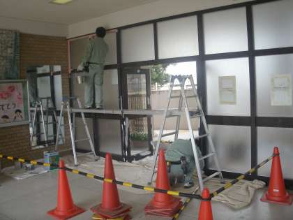 上:玄関の扉の塗装をしています。明るい色にぬりかえています。玄関が明るくなりますよ。下:学習園の工事です。米作りの学習のできる池を作ります。