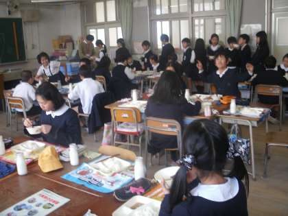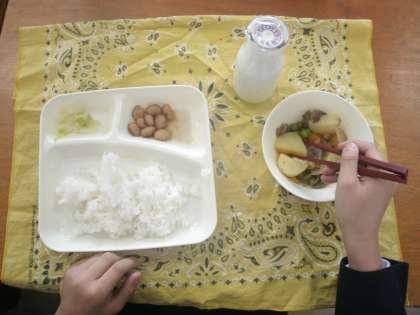 4年1組のおかわりをする子どもたちのならんでいる様子です。ほしくてたまらないのですが、きちんとならんで待っています。こんだては「肉じゃが」「はくさいの甘酢づけ」「とら豆煮もの」。肉じゃがのじゃがいもは北海道産だそうです。ほくほくでした。