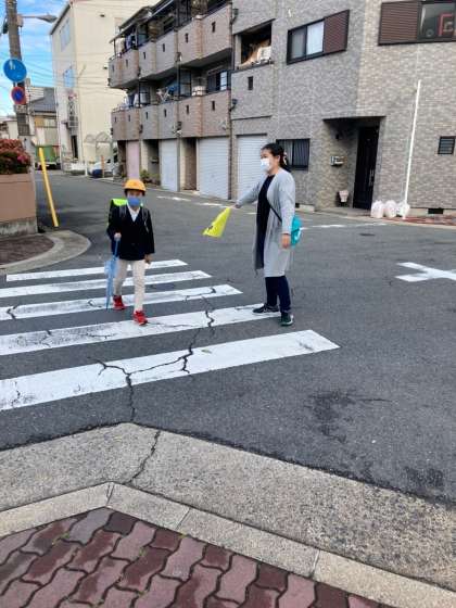 緊急事態宣言の期間延長に伴い、小学校では授業確保や各種健診のため、登下校の時間を少し変更して学習に取り組んでいます。日によって登校時間が変わるため見守り活動が難しい状況ですが、本日は全児童が1時間目から登校となっているため、PTA役員の方が急遽見守り活動を行ってくださいました。