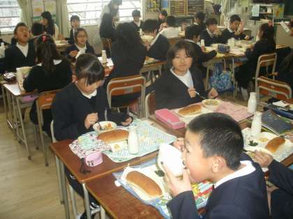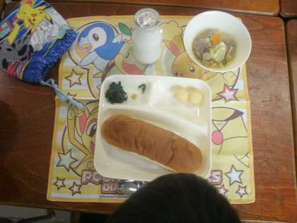 4年3組の給食風景です。こんだては「豚肉と野菜のスープ煮」「あげポテトもち」「ほうれん草とコーンのソテー」。スープ煮がとても人気でたくさんよそい足す子が多かったです。