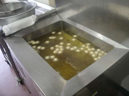 ほんのりあまくて、もちもちした食感。560人分をフライヤーで揚げますが、たくさん油に入れると温度が下がるので、少しずつ揚げていきます。