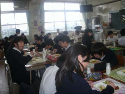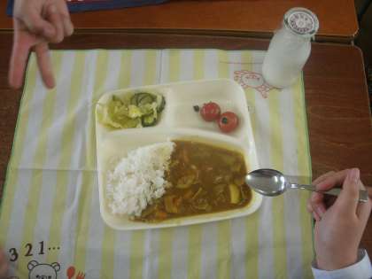 今日の給食は5年1組。こんだては「ポークカレーライス」「グリーンカレー」「プチトマト」。