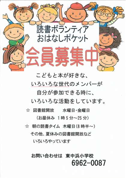 図書ボランティアの募集です。学校の朝の読書や図書館開放で子どもたちのために活躍していただいています。東中浜小学校の自慢の取り組みです。本大好きの子どもがたくさん育っています。