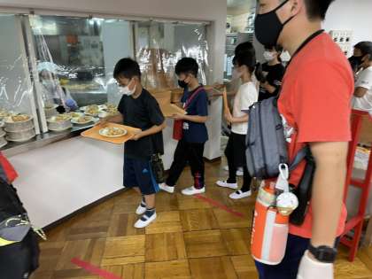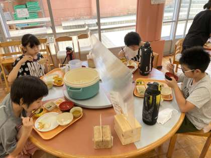 からあげのおいしそうなにおいが館内オリエンテーリングのときからにおってきました。みんなもりもり食べてます。