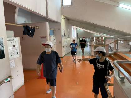 > 自分たちの宿舎を確認しながら周ります。まわった後は、施設に関わるクイズです。しっかり施設を確認できたでしょうか?