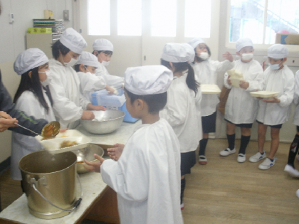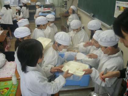2年生の各教室の給食を用意しているようすです。しっかり手際よく配膳していました。上から1組2組3組です。