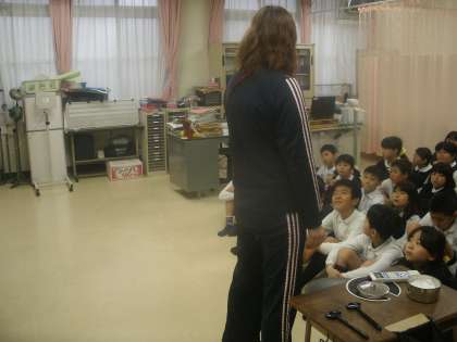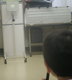 保健室で視力検査が始まりました。今日は3、4年生です。みんな説明をよく聞いていました。