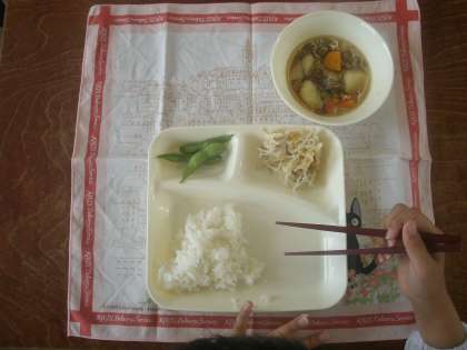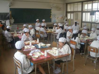 3年1組の給食風景です。「いただきます!」をきちんとして食事します。いい表情していますよね。こんだては「肉じゃが」「もやしのゆずの香あえ」「枝まめ」です。