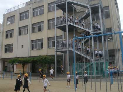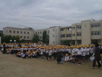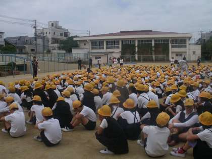 火災による避難訓練を行いました。城東消防署から消防隊のみなさんに来ていただきました。子どもたちは静かに先生の指示に従って避難できました。火災発生の放送があって、3分20秒で運動場の北側に集合できました。