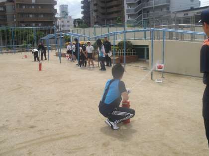 消火訓練です。訓練用の水の入った消火器を使いました。みんな真剣な面持ちでした。