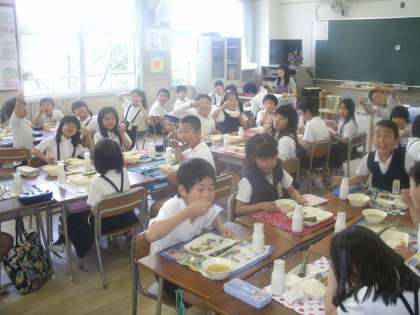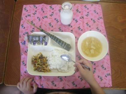 3年2組をたずねました。こんだては「牛肉のちらしずし」「五目汁」「ちまき」で、今日はこどもの日の行事献立でした。1年のこのころにしか食べられないちまきは、毎年、給食につきます。ほんのり甘いおもちです。楽しく食べている子どもたちでした。