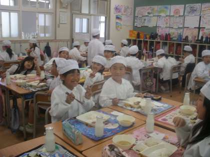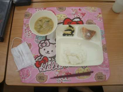 3年3組をたずねました。たのしく明るい教室です。こんだては「赤魚のしょうゆだれかけ」「みそ汁」「わかたけ煮」。たのしい食事風景ですね。