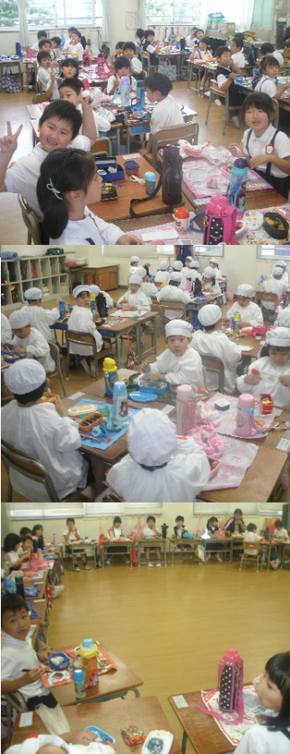 1年生は遠足が延期になったので、教室でお弁当を食べました。遠足に行けなかったのは悲しかったのですが、お弁当はとてもよろこんでいました。