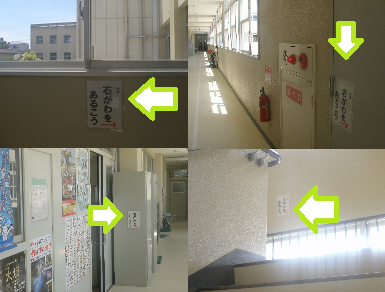 今年度の生活指導の取り組みで、学校内のあちこちに「右がわをあるこう」の表示がされています。「ひがなか」の子どもはあいさつはよくできるし、しっかり人の話を聞く態度もできていますが、ときどきろうかを走る人がいたりぶつかっている人がいたりします。「右がわをあるこう」をしっかり守るようにしたいですね。