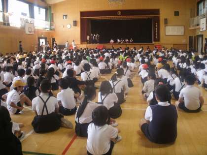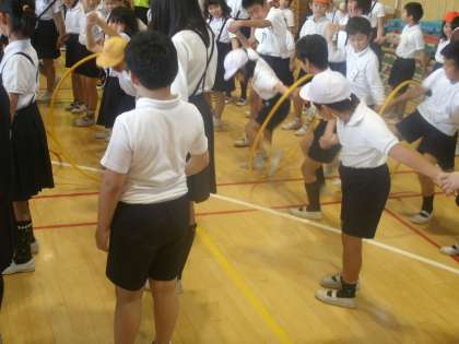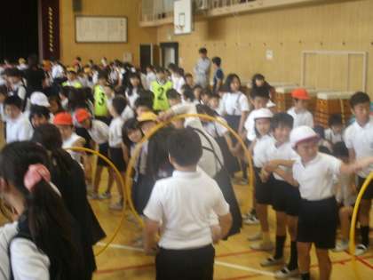 今年度はじめての児童集会。毎週水曜日に「にこにこ班」で集まって、ゲームや各委員会、クラブ活動の発表などをします。今年度の1回目の今日はフラフープリレーです。フラフープをわたしていくリレーです。1年生のはしゃいでいるのや6年生の責任感がよく表れた集会になりました。