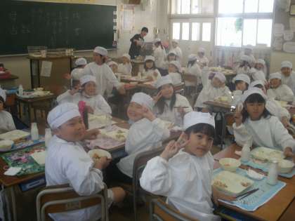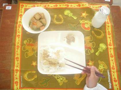 2年2組をたずねました。鶏肉などいっぱいおかわりして、うれしそうでした。給食調理員さんの愛情たっぷりの給食を子どもたちは感じています。こんだては「鶏肉とさんしょう焼き」「じゃがいもとあつあげのみそ煮」「ごまかかいため」。