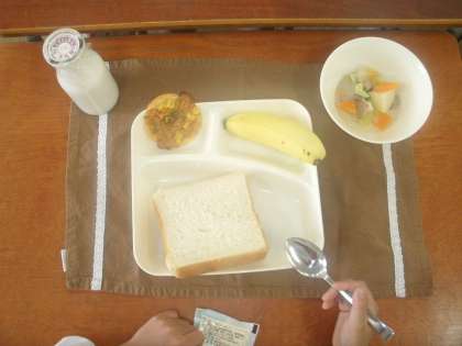 2年3組をたずねました。こんだては「豚肉とキャベツのスープ煮」「変わりピザ」「バナナ」。楽しく食事していました。元気な2の3です。