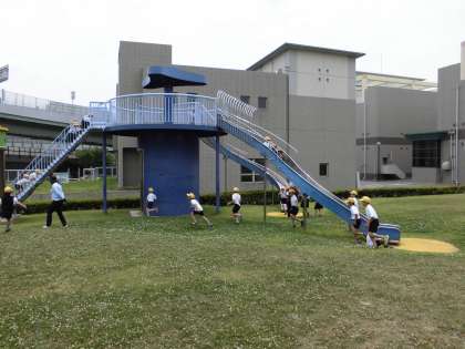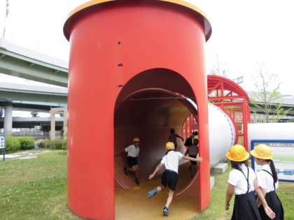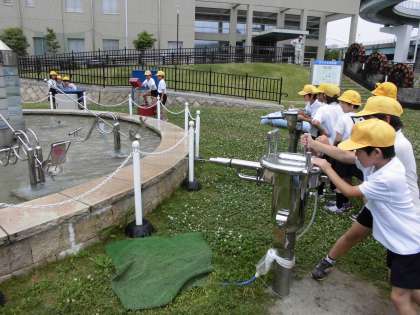 外に出ると、浄水場の庭に水道の仕組みを模した遊具が設置してあり、遊びながら学ぶことができるようになっていました。