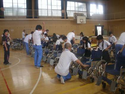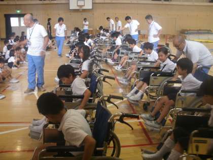 大阪市心身障害者リハビリセンターから車いす体験の指導に来ていただきました。車いすの操作の仕方や押すときの注意、障がい者の方へのサポートのあり方などを教えてくださいました。すべての人がともに暮らし、ともに幸せに生きることのできる社会を担う子どもたちへのメッセージのこもった学習です。