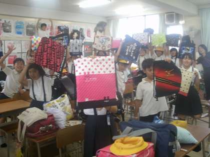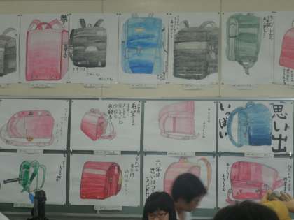 6年生の作品。上はランドセルの絵で細かいところまでしっかりかけています。下はミシンを使って製作したナップサックです。ミシンもうまく使っていました。