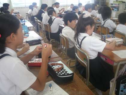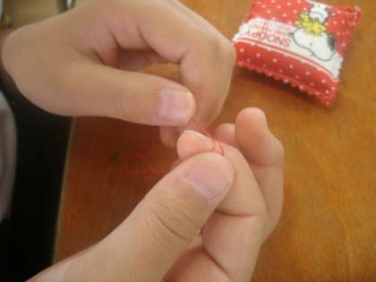 玉どめを作る練習をしていました。指に糸をくるっと巻きつけるのがなかなか難しくて苦労していましたが・・・。おっ、みごと!