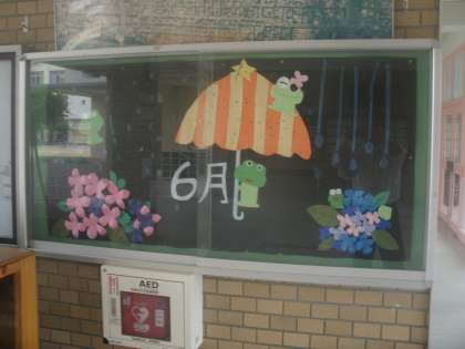 児童会の掲示委員会が毎月作っている玄関掲示。毎月楽しい掲示です。今月は雨の多いころ。傘とあじさいの図柄です。