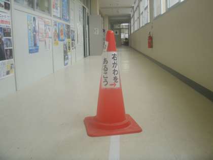 右側通行の意識づけのためにコーンを廊下に置いています。新校舎の2・3階に一つずつですが、なかなか効果的です。
