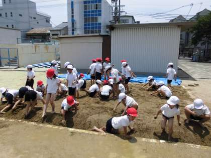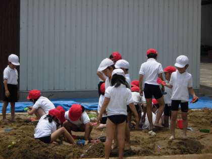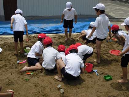 砂場で土遊びの学習です。きれいな砂で泥だんごを作ったり山を作ったり穴を掘ったりとしっかり遊びました。もちろんあとはきちんと砂をならしていました。